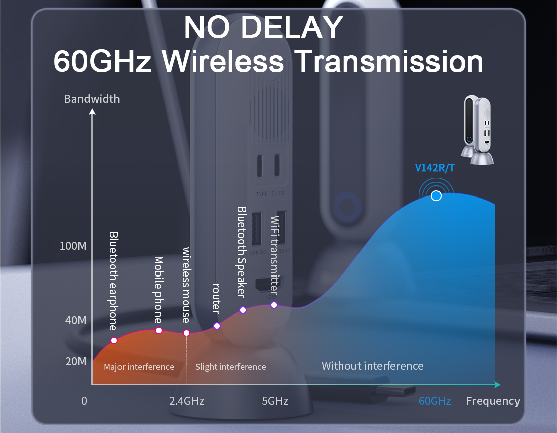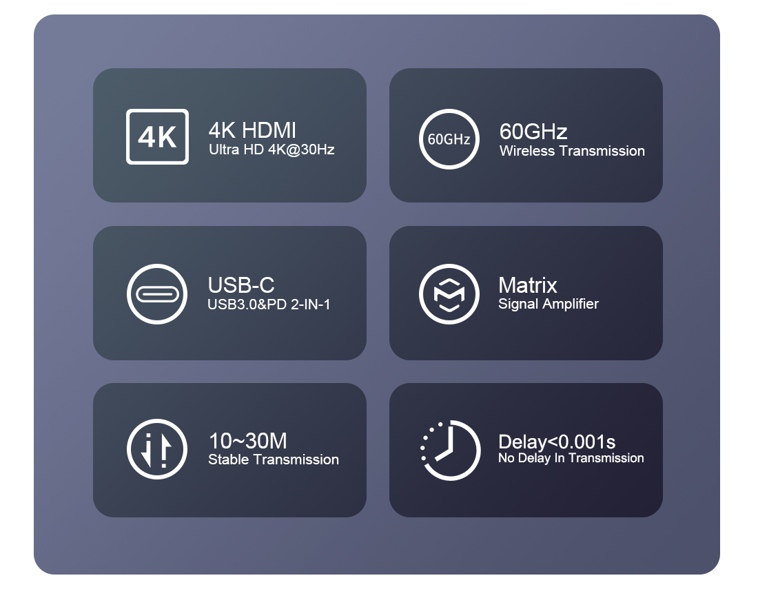 此款高端無線HDMI發(fā)射器擁有出色的25米傳輸距離和快速的圖像傳輸能力,極大地提高了用戶的使用體驗(yàn)。該產(chǎn)品配備USB-C和HDMI輸入接口,能夠連接大多數(shù)USB-C移動(dòng)設(shè)備和筆記本電腦,方便實(shí)用。雙USB-C接口具有盲插、數(shù)據(jù)傳輸(USB-C 3.1)和快速充電(PD3.0)等多種功能,同時(shí)還可以為設(shè)備和自身充電。此外,兩個(gè)USB-A接口支持?jǐn)?shù)據(jù)讀取、鼠標(biāo)和鍵盤連接,也可以作為擴(kuò)展塢滿足各種工作需求。此款無線HDMI發(fā)射器配備高端毫米波無線HDMI接收器,與發(fā)射器一起使用,可實(shí)現(xiàn)無縫連接和配對。產(chǎn)品還擁有USB-C充電端口和HDMI端口支持視頻輸出功能,用戶無需再為繁瑣的電線連接而煩惱,享受更加舒適方便的使用體驗(yàn)。